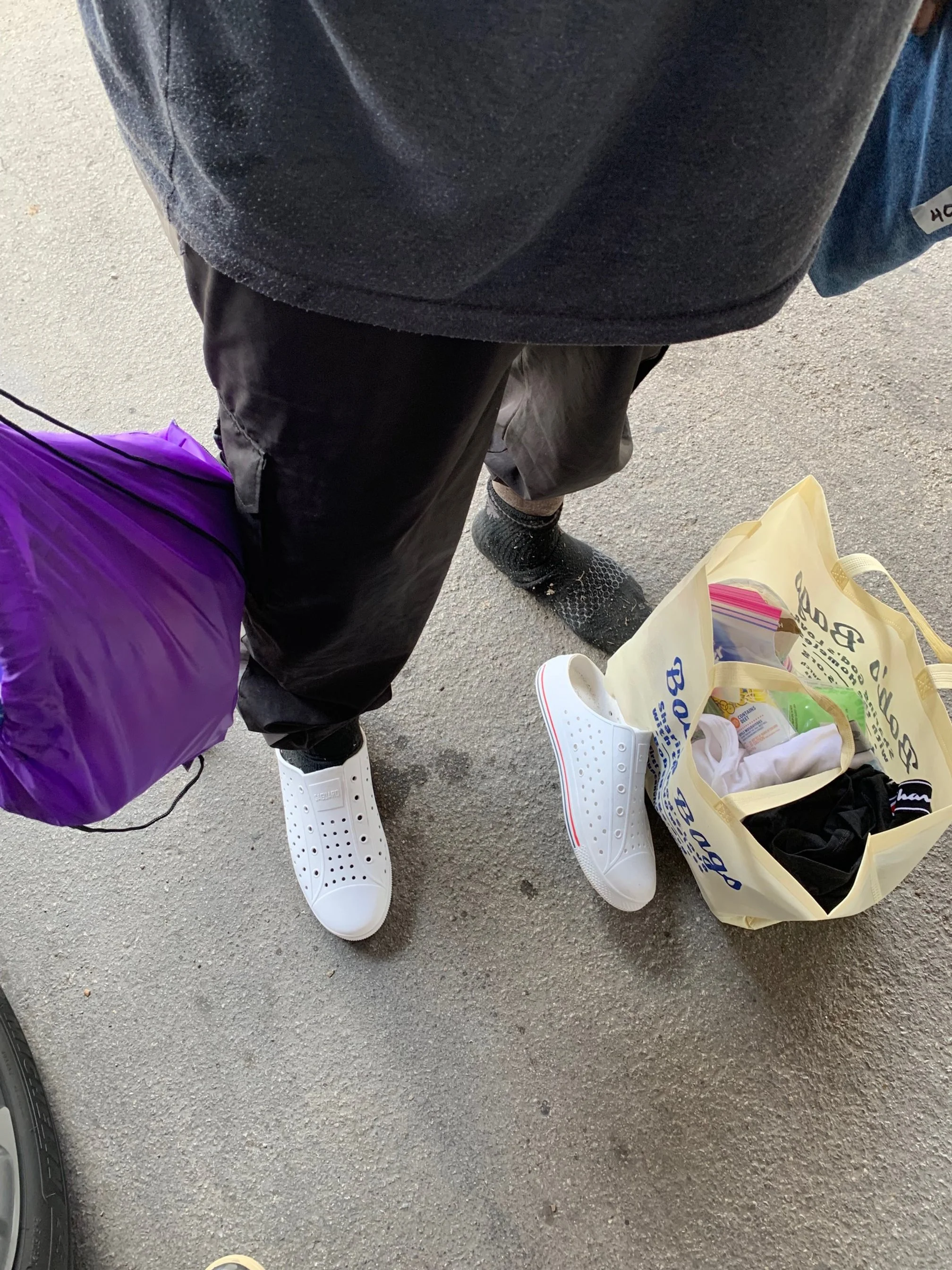 We continue to meet people with totally worn out shoes; every outreach we find one or more people with no shoes. We generally give out forty to fifty pairs of pre-owned shoes each month. Our stock of shoes is critically low and we are desperate for larger shoes, women’s (9-11), and men’s (10-15).