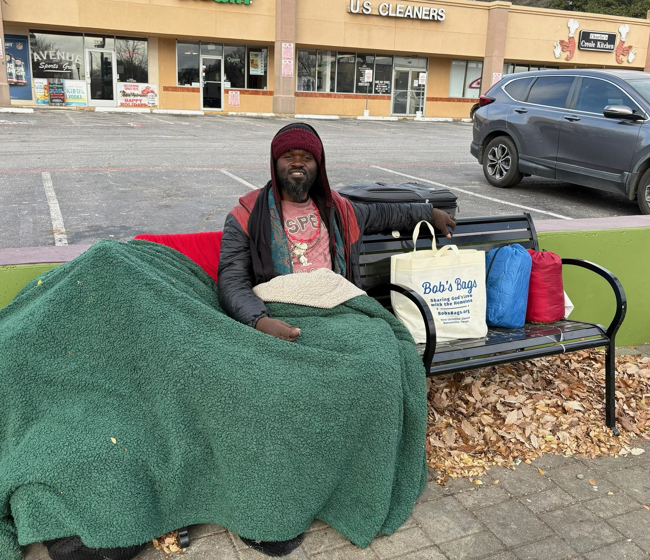 Team member Cristen met “T” while walking her dog. Cristen shared a Bob’s Bag, sleeping bag, blanket, pants, and shoes.