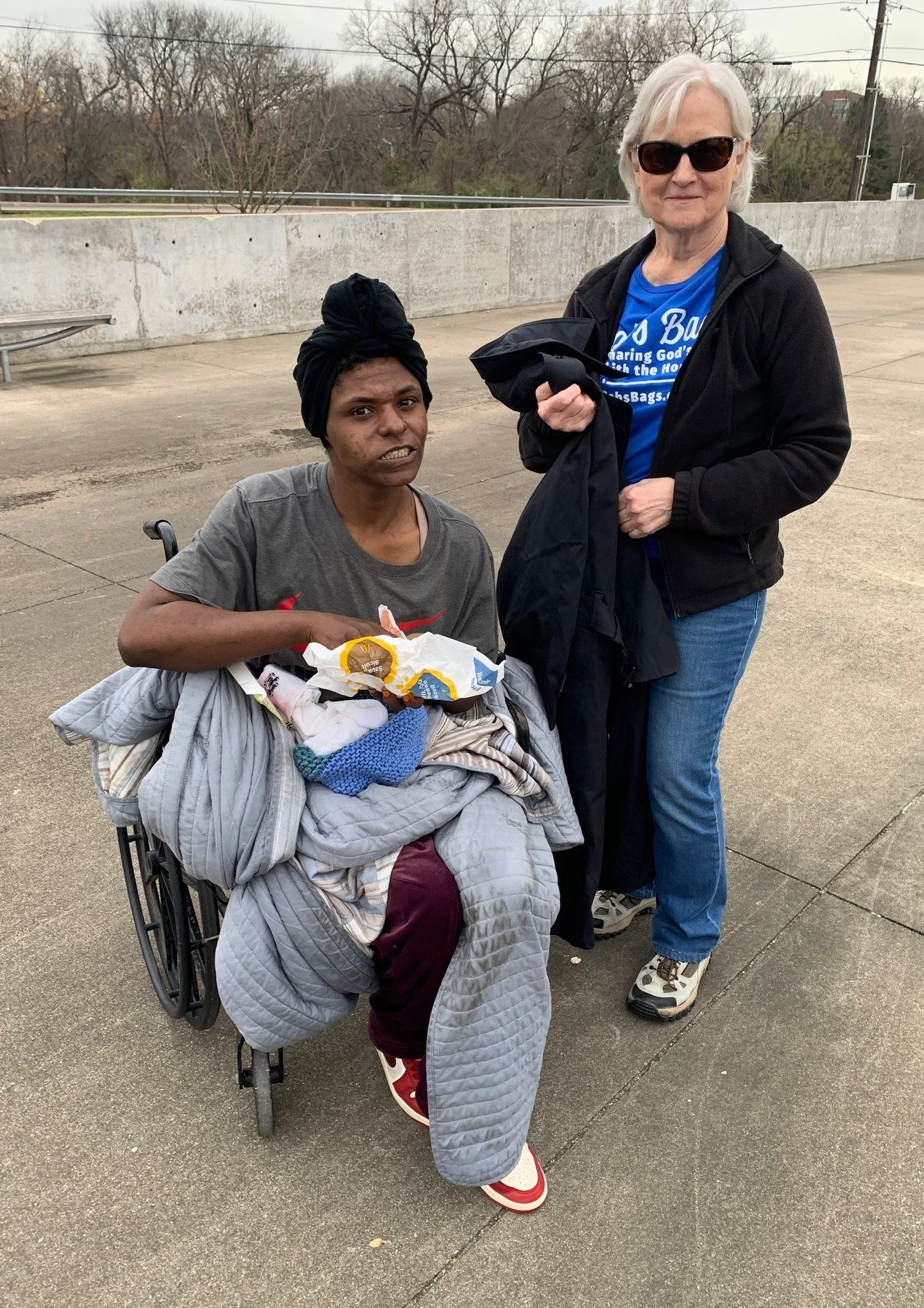 We met Renee, in the grey sweater, age 57, earlier. She was living in a tent under a nearby bridge. We gave her a black coat and other supplies.