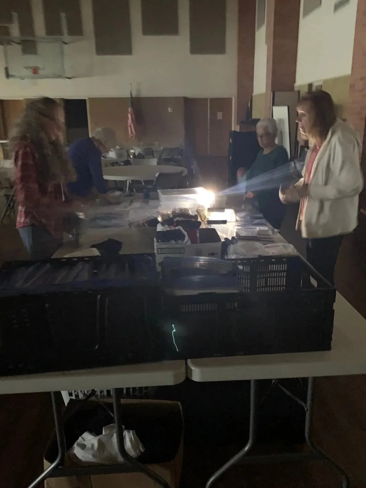 We begin assembling bags and about two minutes later the lights go out. No electricity! Our group says, “no problem”, and still finish the bags in the dark. Then, of course, the lights came back on! PTL