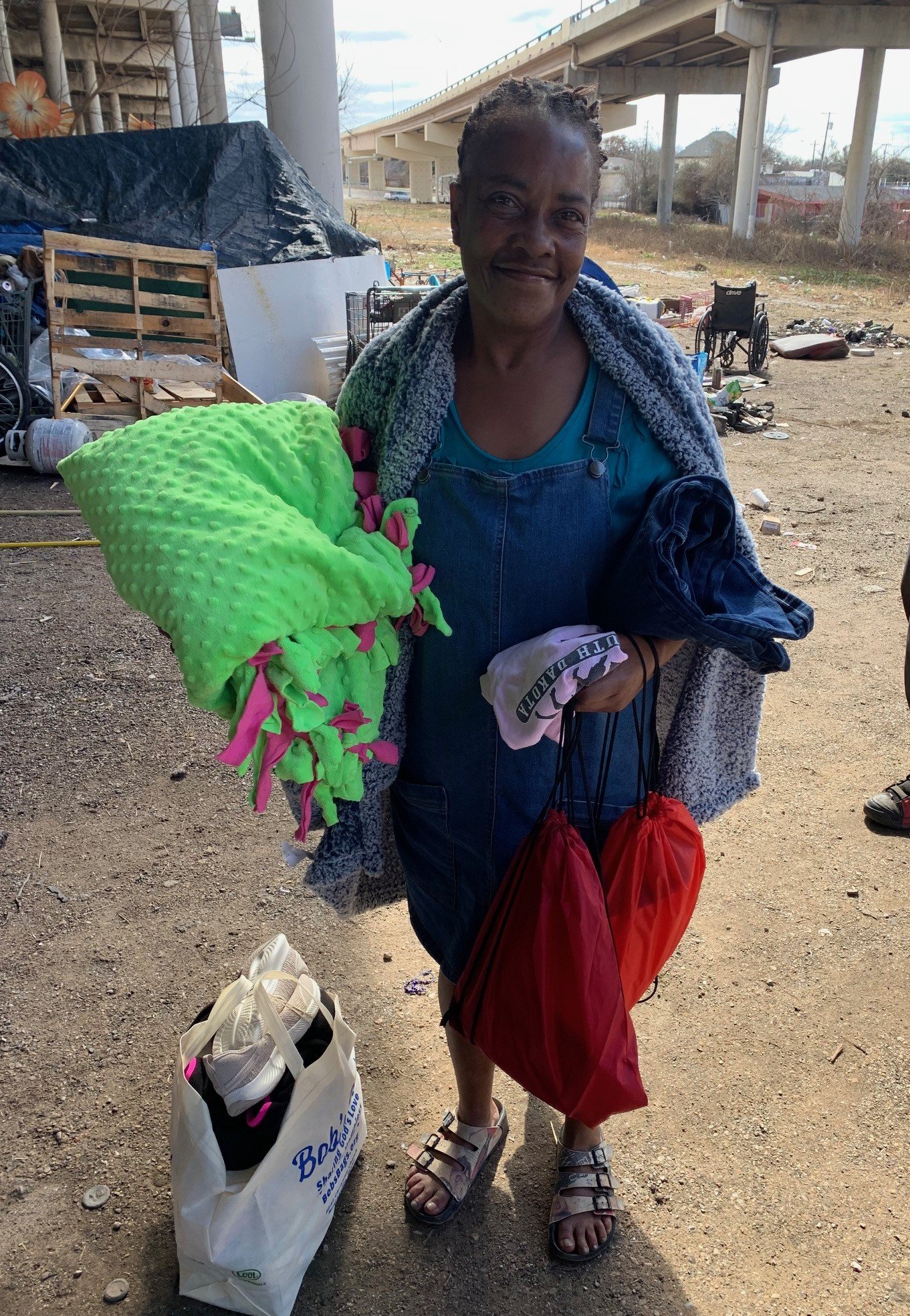 Jerry helping out with hats, gloves, underwear, sleeping bags, and blankets